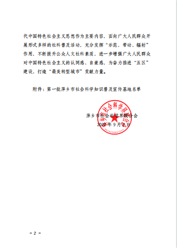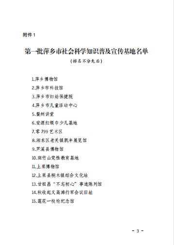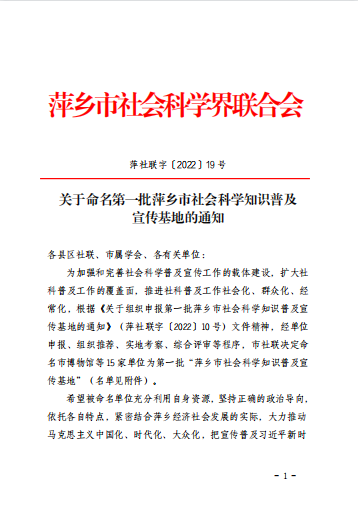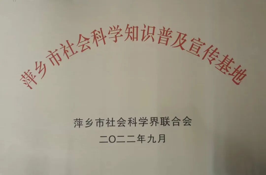 2022年9月2日,萍乡市社会科学界联合会下发《关于命名第一批萍乡市社会科学知识普及宣传基地的通知》,萍乡博物馆榜上有名,荣获第一批萍乡市社会科学知识普及宣传基地。