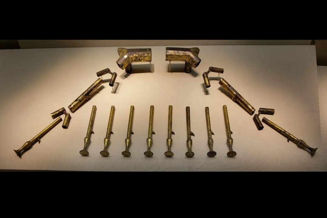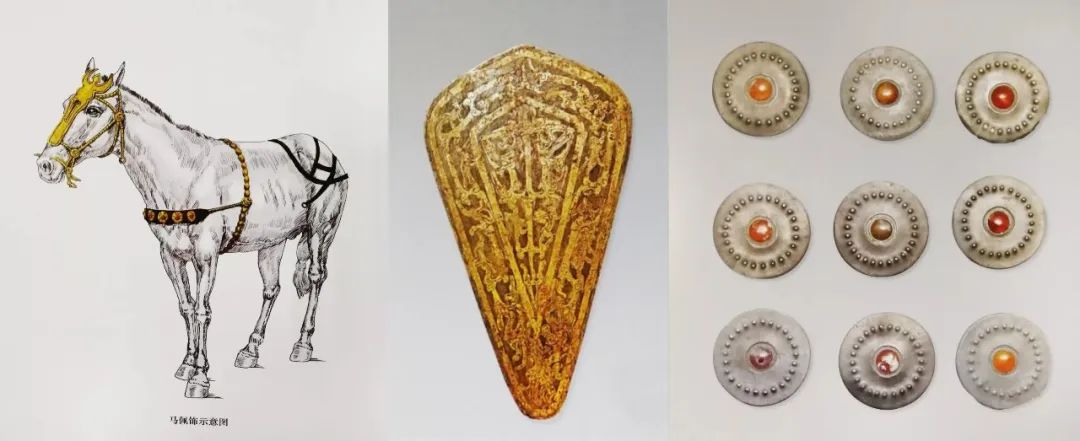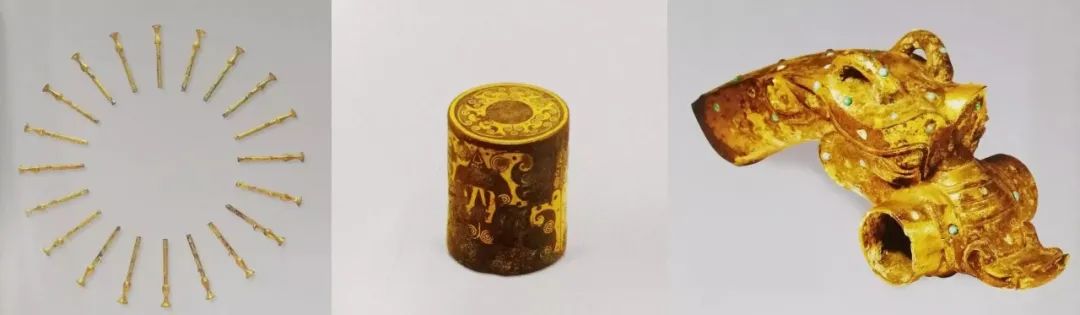 △ 作为车盖配件的鎏金花型铜盖弓帽(左)、错金银铜盖顶冒(中),作为车辕装饰的鎏金镶嵌龙首形铜辕饰(右)。现藏于河北博物院。