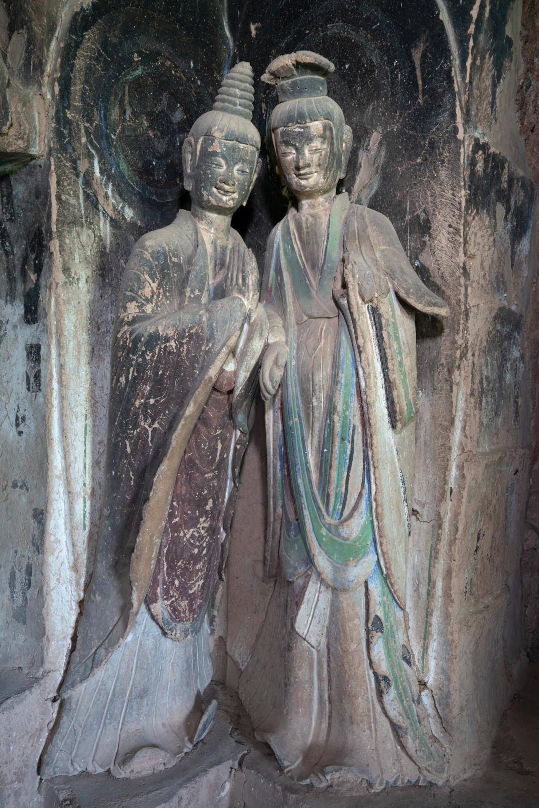 △麦积山石窟第121窟,正壁龛右侧《菩萨与弟子》彩塑。