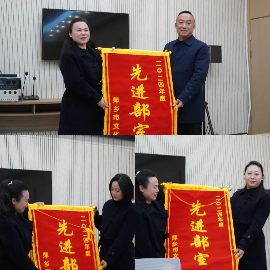 会上,艺术科科长许鹏达宣读了《2024萍乡市文化馆评先评优结果》,获表彰部室及个人分别上台领取锦旗与证书。