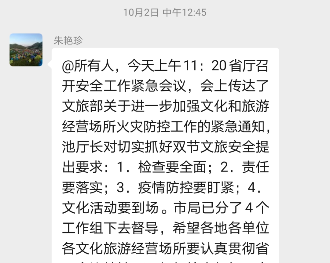 根据《文化和旅游部办公厅关于进一步加强文化和旅游经营场所火灾防控工作的紧急通知》、《省文化和旅游厅关于安排2020年国庆节、中秋节假期旅游景区督查工作的通知》要求,10月2日,市文广新旅局紧急下发《关于开展2020年国庆中秋期间文广新旅系统安全生产督导的通知》,要求各县(区)举一反三,引以为戒,加强对辖区内景区设备设施、文化场馆、文化旅游场所,A级旅游景区,星级饭店、民宿安全隐患进行再排查,做到无死角、全覆盖。同时成立了四个督导组,对各文化旅游行业企业进行集中督导。