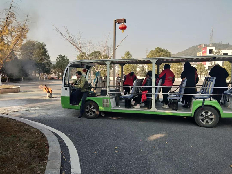 观光游览车载着游客在停车场下车,突然间起了火,更有一名游客受伤倒地,景区员工看到上前帮助,等待救援。观光车司机给景区行政办打电话寻求救援,行政办立刻做出安排,拉开火警警报器,安排景区保安人员立即出发,去往着火地点进行救火,安排导服组、售票组、以及智慧办和保洁组进行人群的疏散和情绪的安抚以及伤员的救助,工程水电组负责拉开警戒线隔离出危险区域,让游客撤离到安全地带。