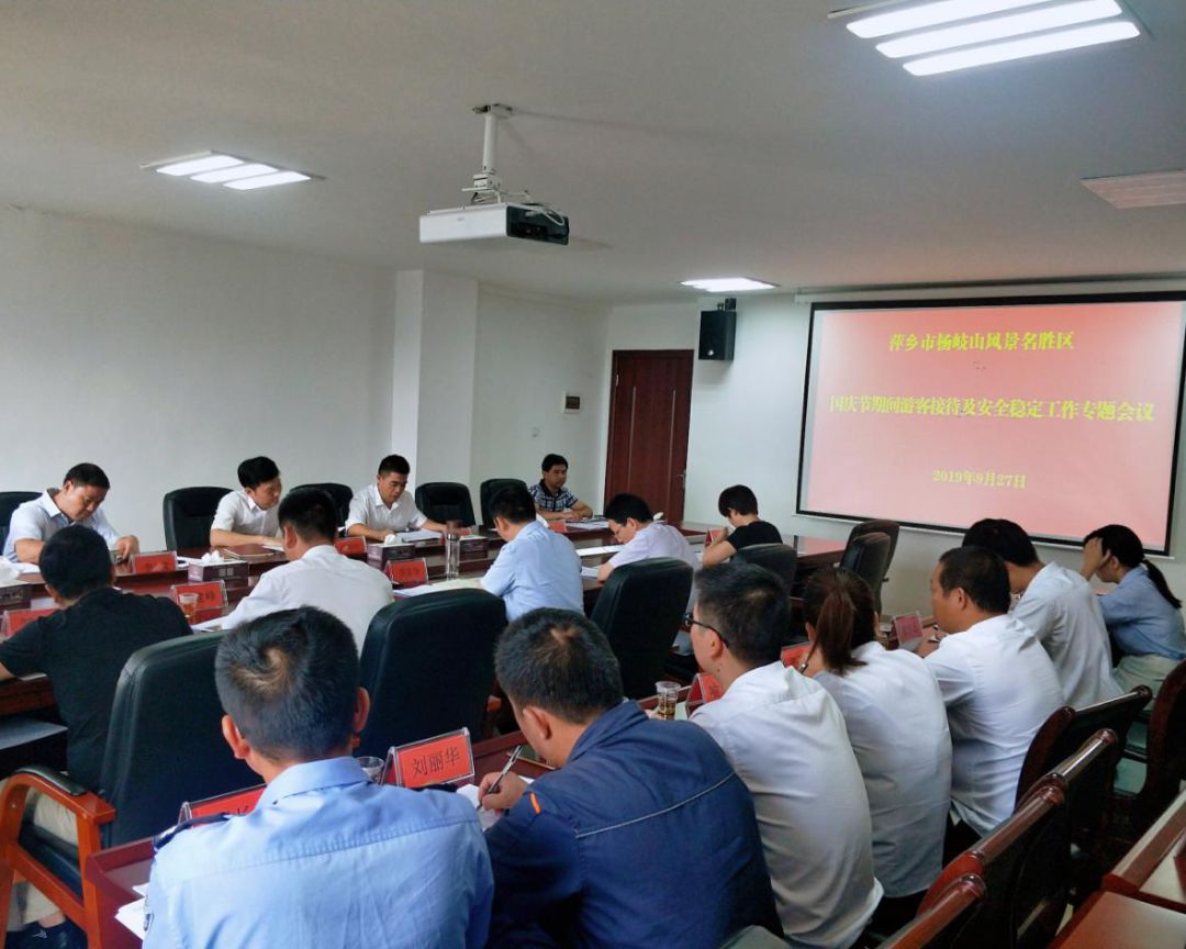 9月27日上午,杨岐山景区召开2019年国庆节期间游客接待与安全稳定工作专题会议,景区班子、全体机关干部和杨岐山旅发公司班组长参加会议,会议由景区党委委员、副主任欧阳宜春同志主持。