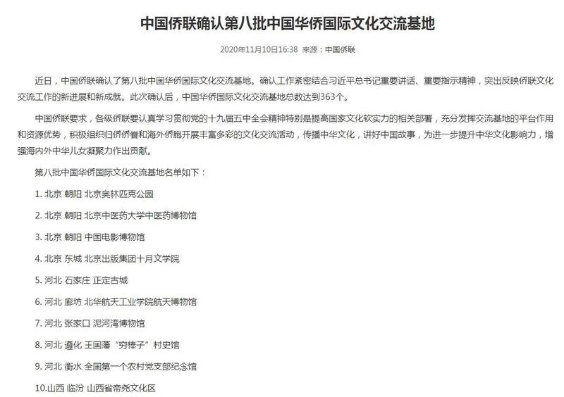 此次评审确认工作紧密结合习近平总书记重要讲话、重要指示精神,突出反映侨联文化交流工作的新进展和新成就,根据《中国华侨国际文化交流基地管理办法》,并经中国侨联主席办公会议审定,全国共有93家机构和单位被确认为第八批“中国华侨国际文化交流基地”,其中江西省有3家。此次确认后,中国华侨国际文化交流基地总数达到363个,其中江西共有南昌市汪山土库、宜春禅都文化博览园、抚州汤显祖纪念馆、景德镇皇窑陶艺研学基地、九江市庐山白鹿洞书院、瑞金中央革命根据地纪念馆、吉安市博物馆、上饶市鹅湖书院、安源路矿工人运动纪念馆、中国血防纪念馆、王阳明展览馆(崇义县博物馆)11家。