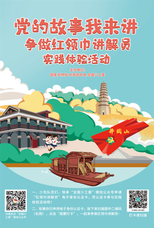 为庆祝中国共产党成立100周年,由国家文物局、共青团中央、全国少工委主办的“党的故事我来讲——争做红领巾讲解员”实践体验活动正式上线啦!全省所有少先队员均可通过“全国少工委”微信公众账号申请“红领巾讲解员”电子身份认证卡,在萍乡博物馆检票入口及主馆陈列大楼前扫描海报上的二维码,进行学习打卡并上传个人作品,欢迎全体少先队员来到萍乡博物馆参观,打卡“党的故事我来讲——争做红领巾讲解员”实践体验活动!