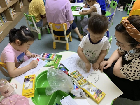 最后的亲子手工拓展环节,老师给小朋友们发放了一张有“飞龙”图案的纸,指导小朋友们发挥自己的想象力给龙填上颜色,随后,用剪刀把龙头和龙尾分开,再用皱纹纸把它们相连,最后用吸管或者冰棍棒用双面胶固定住,这样就得到了一个简易版的“舞龙狮”了。看,小朋友们一个个做得多认真呀!此次活动不仅让小朋友听到了有趣的故事会,也从绘本故事中学到了很多关于中国传统节日的知识,同时也增强了小朋友的动手能力。