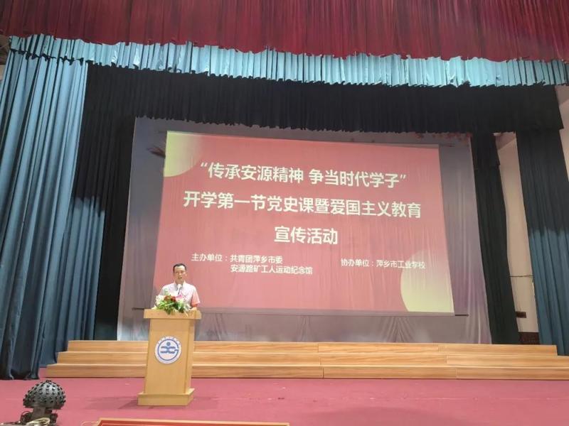 9月2日下午,安源纪念馆联合共青团萍乡市委开展“开学第一节党史课”爱国主义教育主题宣传活动走进萍乡市工业学校,号召广大青年学生坚定理想信念,志存高远,脚踏实地,勇做时代的弄潮儿。萍乡市工业学校党委书记何入军、安源纪念馆副馆长黄洋、萍乡市工业学校副校长陈峰、团市委学少部黄欣欣出席活动。