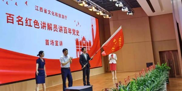 6月29日下午,江西省文化和旅游厅举行了全省“百名红色讲解员讲百年党史”首场宣讲活动,安源纪念馆刘帆凌和段志能两位同志作为红色旅游“五好讲解员”参加了“百名红色讲解员讲百年党史”首场宣讲,省文化和旅游厅党组书记、厅长李小豹同志为宣讲团授旗。